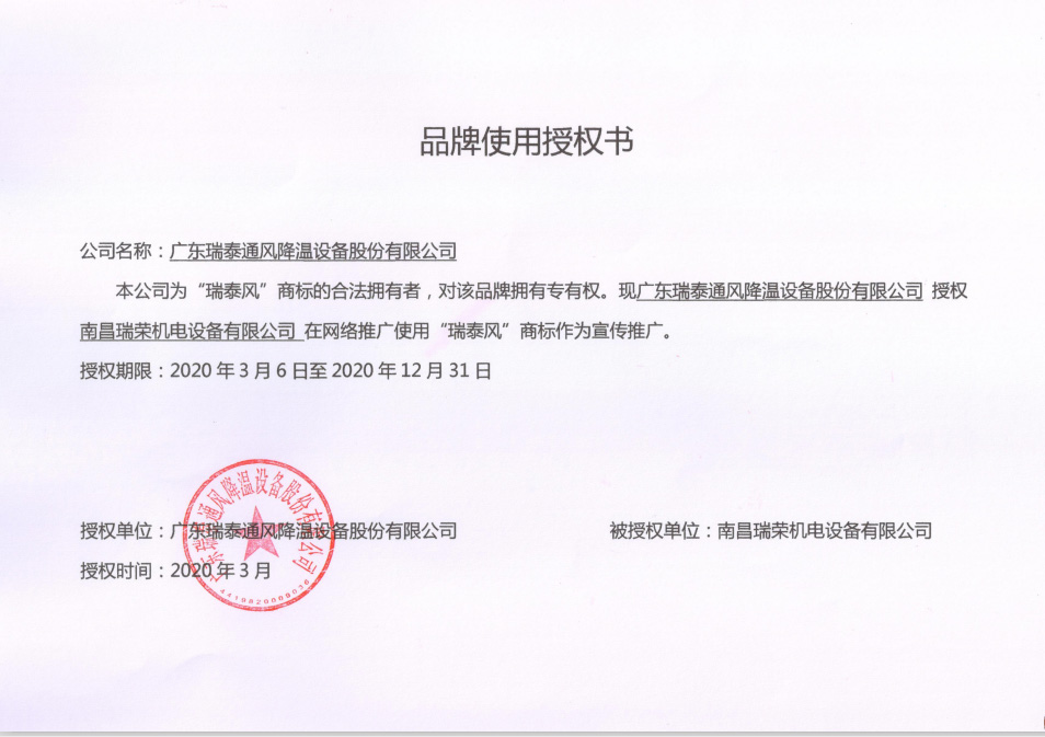 2020「瑞泰風(fēng)」品牌使用授權(quán)證書