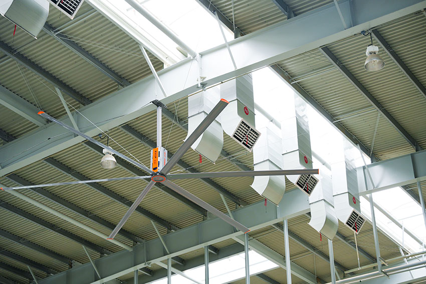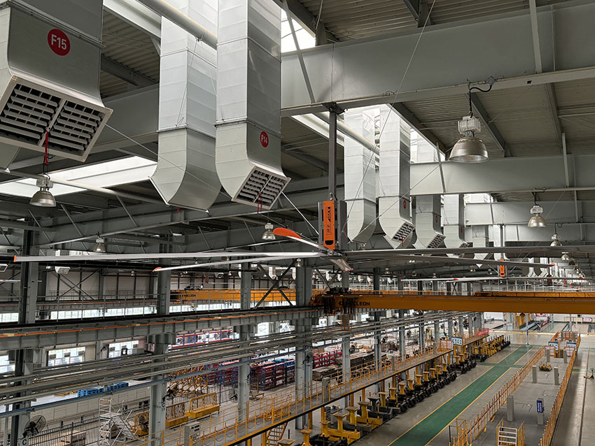工業(yè)大風扇:在車間高空位置安裝大功率工業(yè)風扇,通過大風量的氣流循環(huán),將冷風機產(chǎn)生的冷風更有效地散布到車間的每個角落,同時促進車間內(nèi)空氣的流通,避免局部高溫和悶熱。