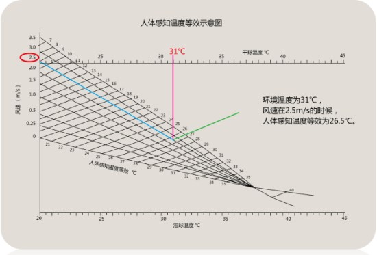 瑞泰風(fēng)節(jié)能風(fēng)扇運(yùn)行時加快了空氣流動的速度,從而加快了汗液的蒸發(fā),汗液蒸發(fā)的過程中帶走了身體上的熱量,所以說,我們會感覺到?jīng)隹?。而具體風(fēng)速對人體感受能有多大影響,上圖為美國研究數(shù)據(jù)圖表。對應(yīng)不同溫度不同風(fēng)速,人體感受差異變化曲線。